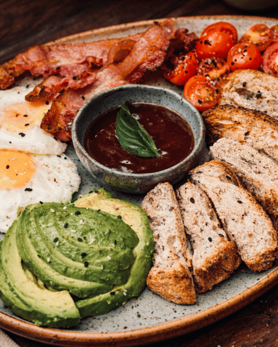 Pan de masa madre, palta en rodajas, huevos arepados.